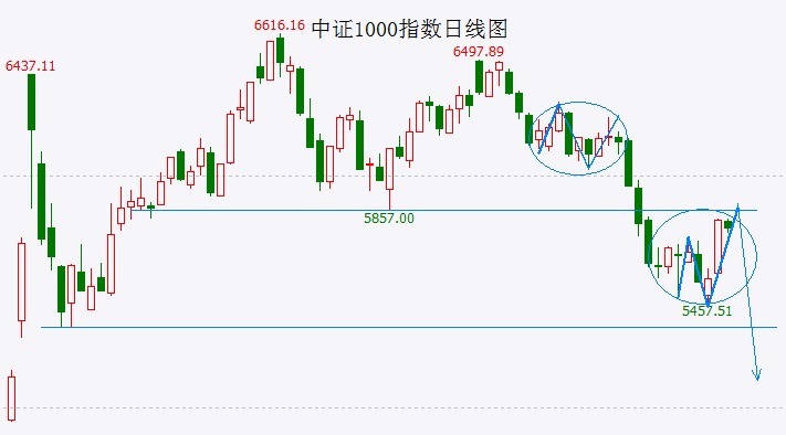 大涨后大盘显露颓势,中证1000指数目前面临颈线位的强阻力,这里很难站上,接下来再度掉头向下的可能性很大。