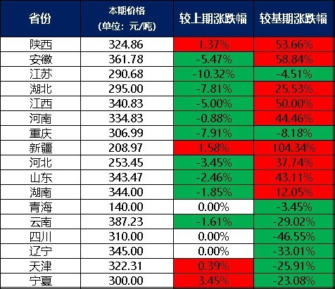 分价格区间来看,本期两碱工业盐单价在300元/吨及以上的地区有12个,分别是陕西、安徽、江西、河南、重庆、山东、湖南、云南、四川、辽宁、天津、宁夏;两碱工业盐单价在300元/吨以下的地区有5个,分别是江苏、湖北、新疆、河北、青海。